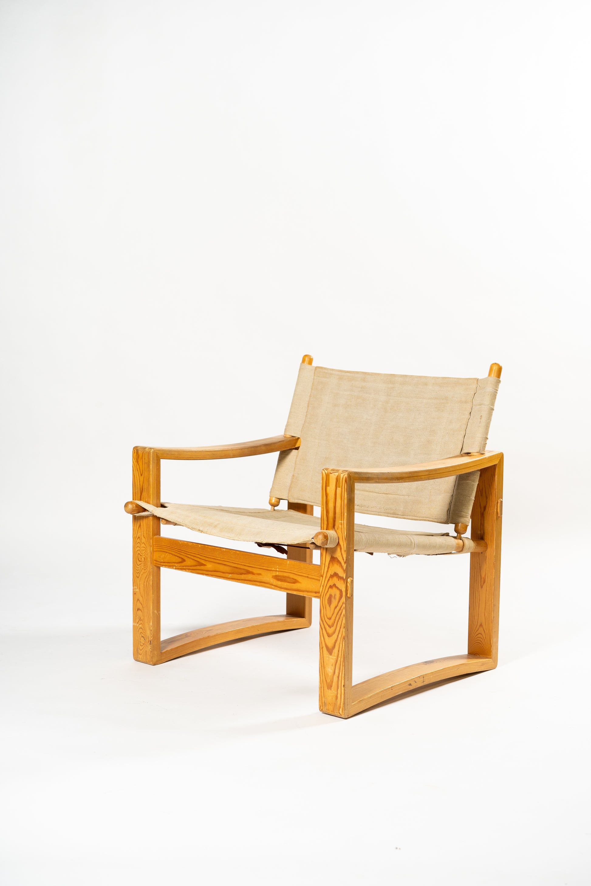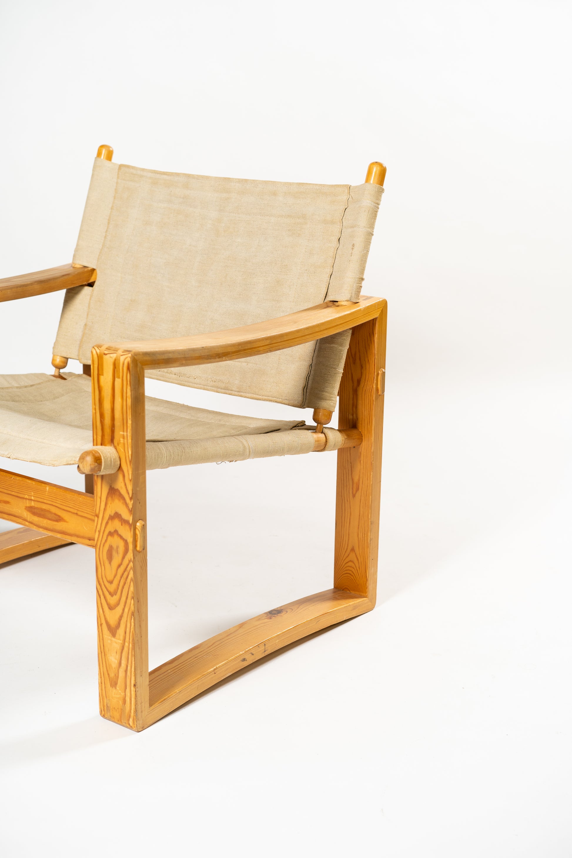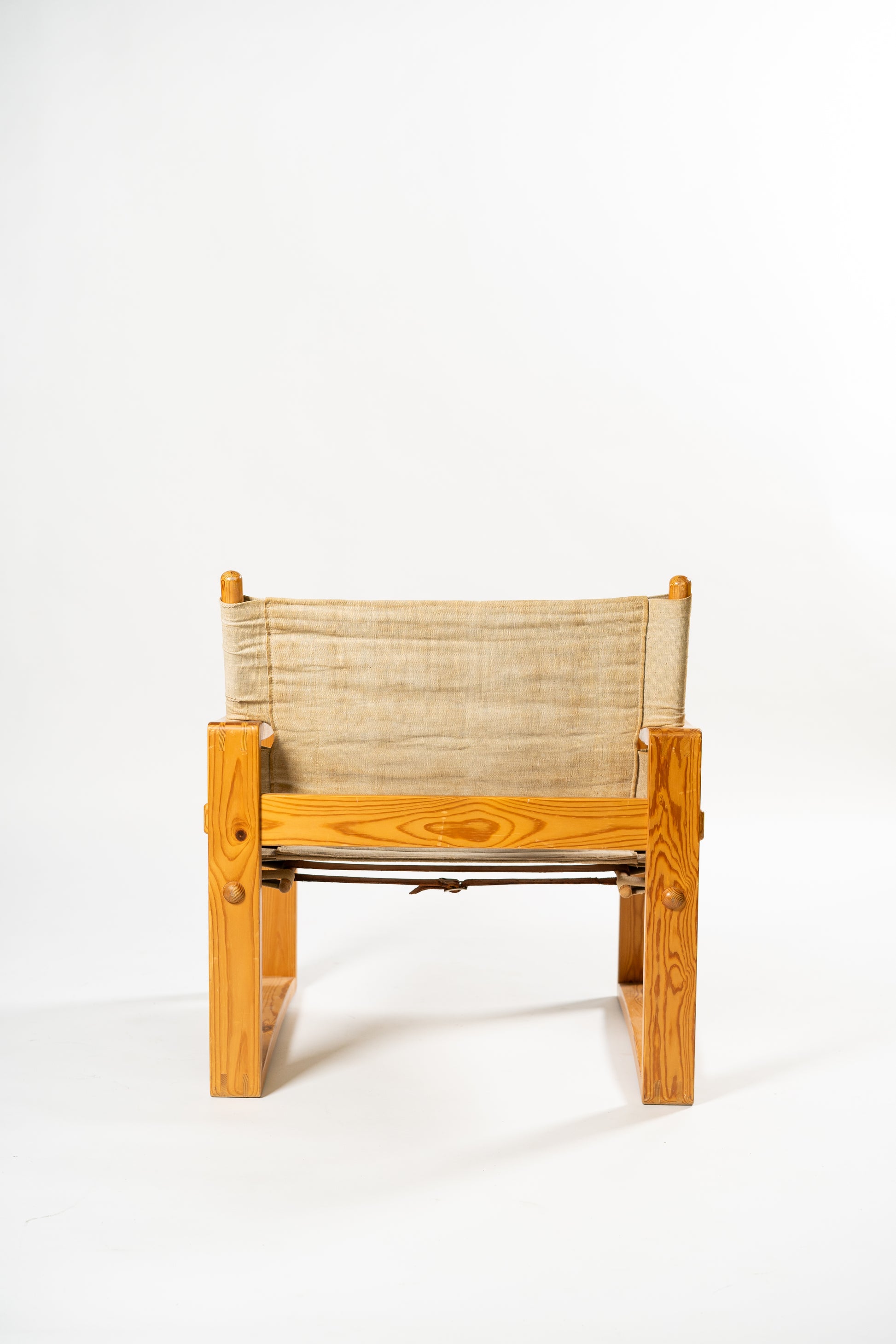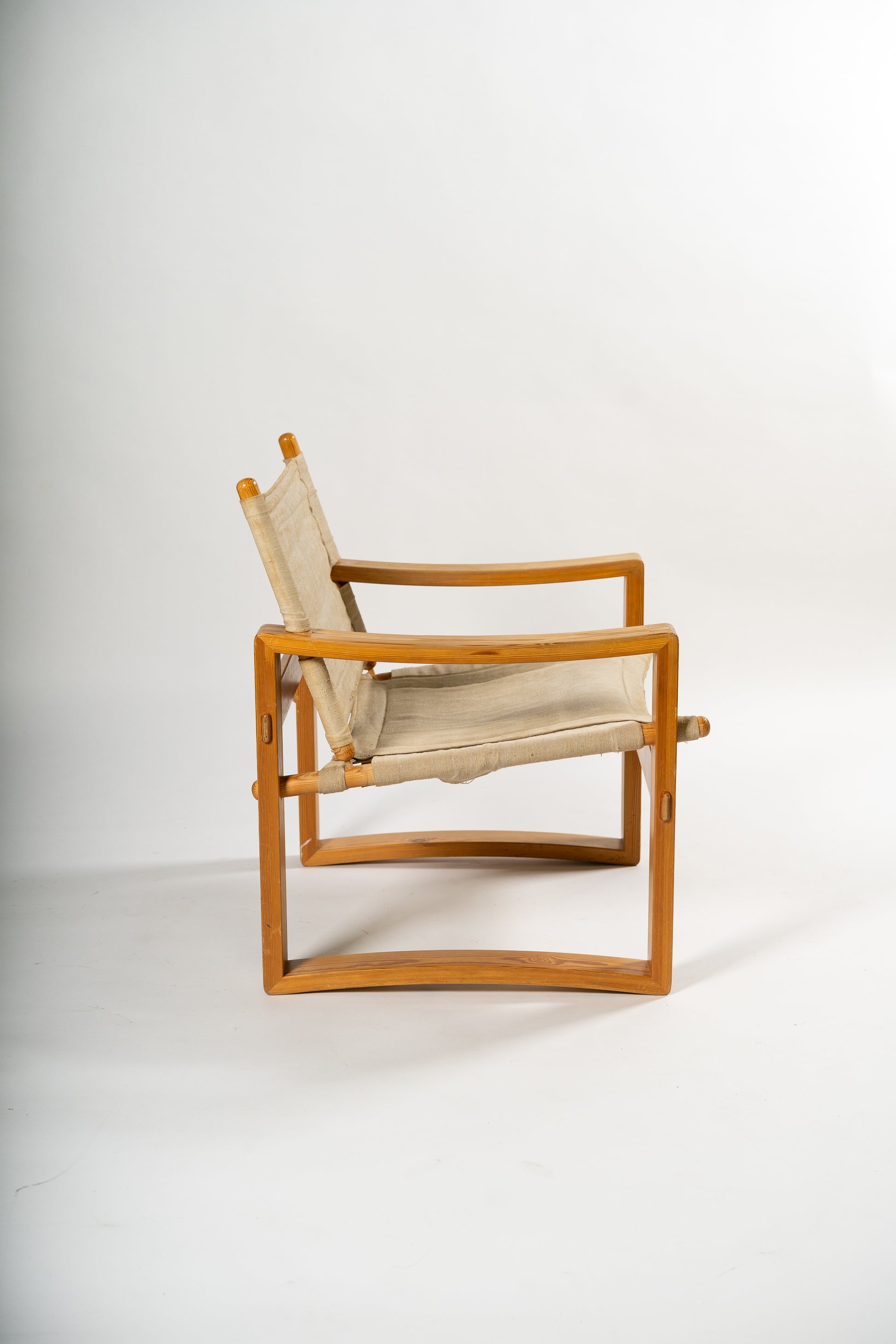 Beautiful pine wood Safari chair with a classic vibe but very unique details like the bend arm rests and leg structure making the chair stand on 4 points instead of 2 rails. Leather (straps) and fabric are in good condition but show their age